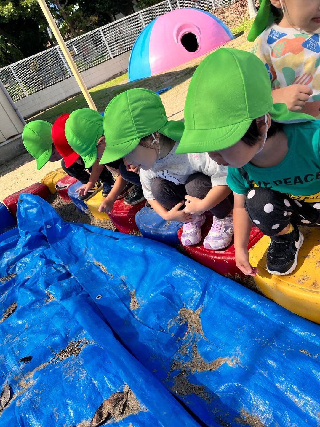 お寺に秋を探しに行ったたんぽぽ組🍁柿の木の下で柿を見つけ、触ったり匂いを嗅いでいました。もみじの絨毯ができていたので、その上に座ってサクサクという音を楽しんだり上からもみじのシャワーを浴び、秋を五感で味わってきました!