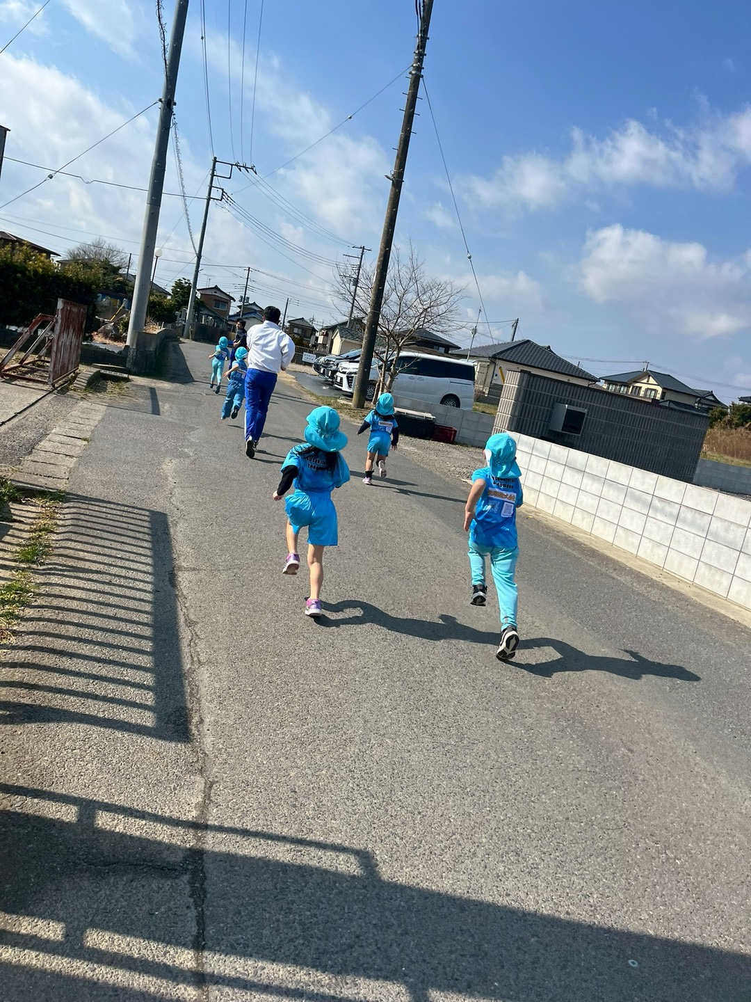 田んぼ道で「よーいどん」の合図で全力疾走の子どもたち。
